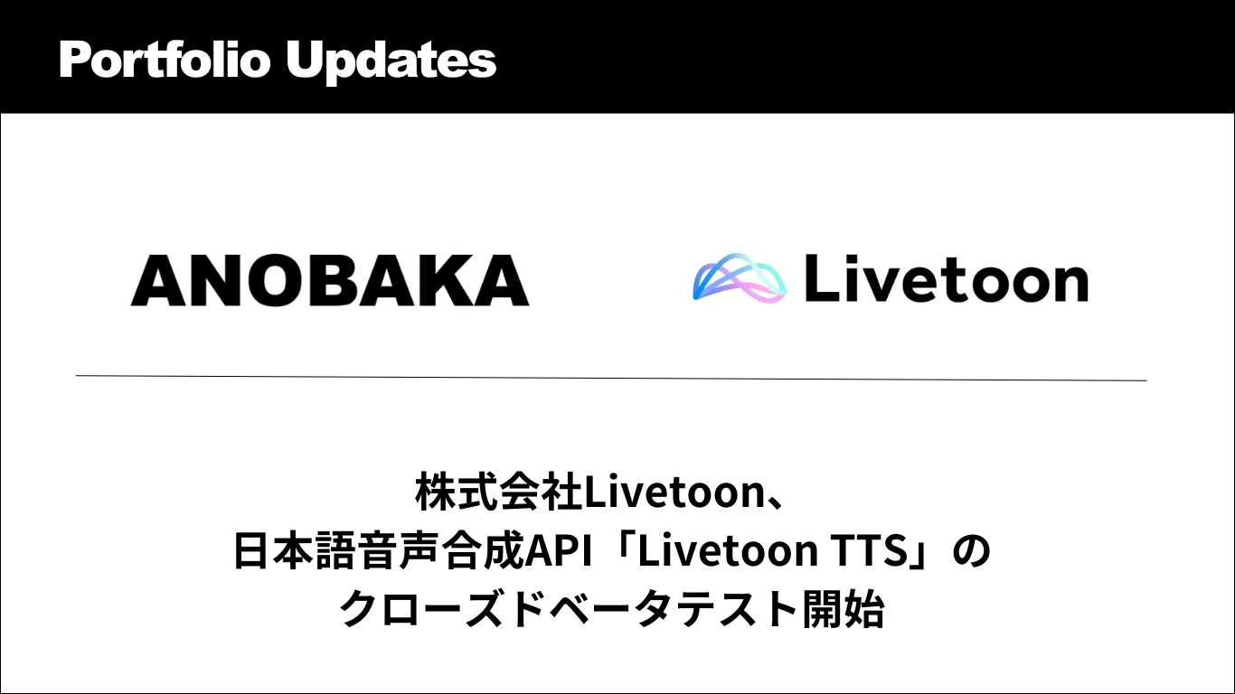 株式会社ANOBAKA(本社:東京都港区、代表取締役:長野泰和、以下、ANOBAKA)は、同社が運用するGenerative AIネイティブなスタートアップに特化した創業支援ファンド「GAIファンド」の投資先である株式会社Livetoonが、日本語音声合成API「Livetoon TTS」のクローズドベータテストを開始したことをお知らせいたします。