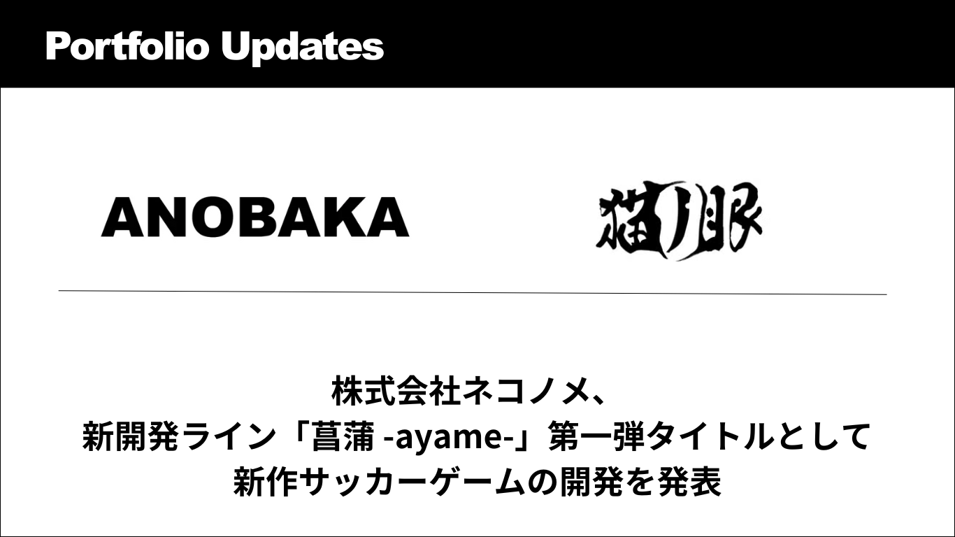 株式会社ANOBAKA(本社:東京都港区、代表取締役:長野泰和、以下、ANOBAKA)の投資先である株式会社ネコノメは、新たに設立した開発ライン「菖蒲 -ayame-」の第一弾タイトルとして、新作サッカーゲームを開発中であることをお知らせいたします。