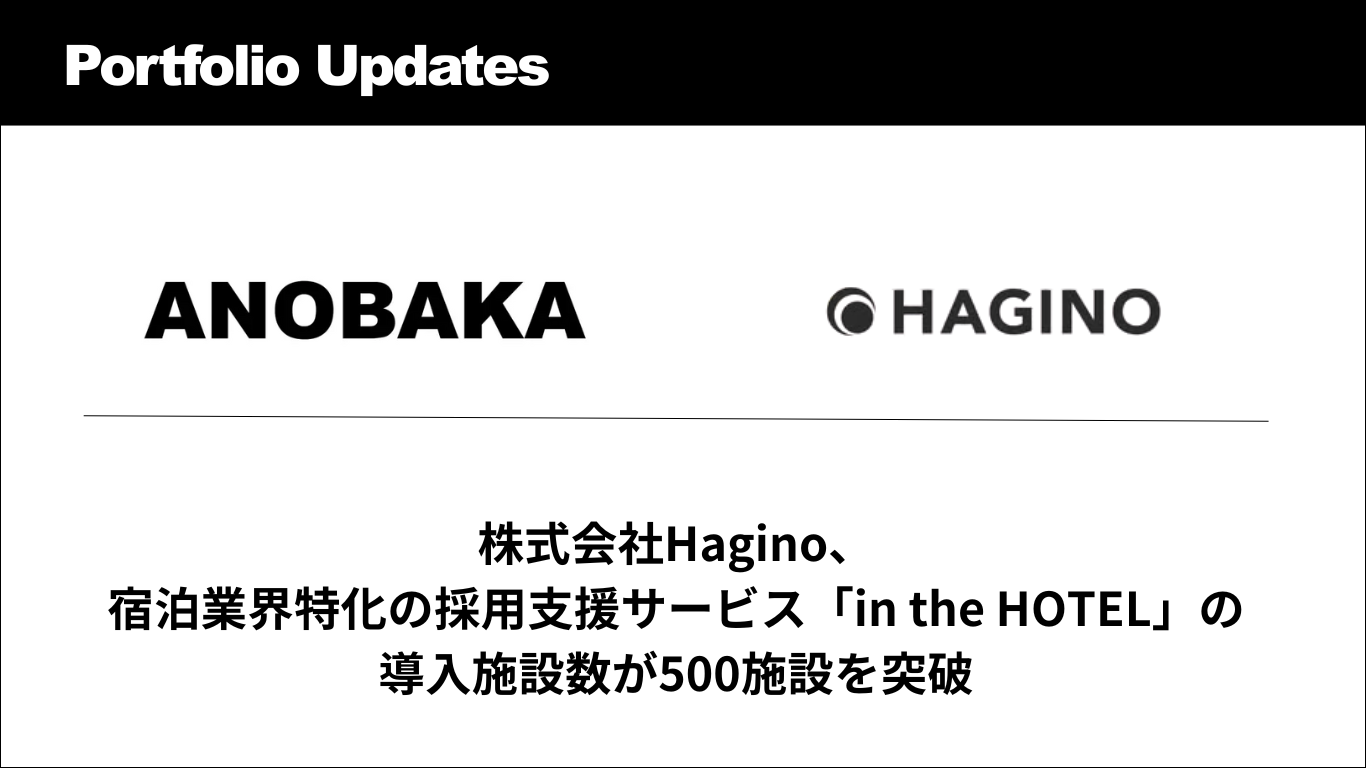 株式会社ANOBAKA(本社:東京都港区、代表取締役:長野泰和、以下、ANOBAKA)の投資先である株式会社Haginoが、宿泊業界特化の採用支援サービス「in the HOTEL」の導入施設が500施設を突破したことをお知らせいたします。