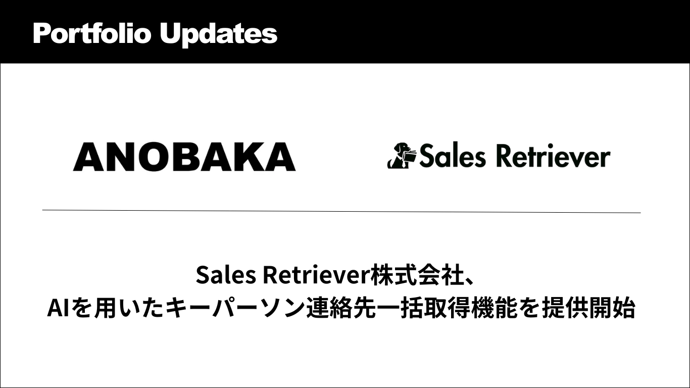 株式会社ANOBAKA(本社:東京都港区、代表取締役:長野泰和、以下、ANOBAKA)の投資先であるSales Retriever株式会社は、営業担当者の大手企業開拓を支援するAI「Sales Retriever」において、新たに「キーパーソン連絡先一括取得機能」を正式リリースしたことをお知らせいたします。本機能により、複数企業に対して効率的にキーパーソン情報を取得し、より的確なアプローチが可能になりました。