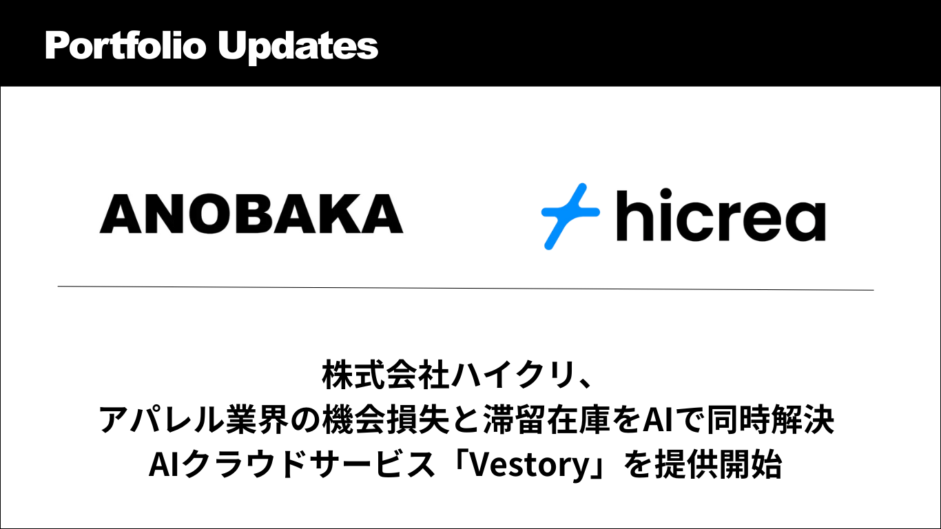 株式会社ANOBAKA(本社:東京都港区、代表取締役:長野泰和、以下、ANOBAKA)投資先である株式会社ハイクリが、アパレルブランドの期中における在庫管理・販売管理を支援するAIクラウドサービス「ベストリー(Vestory)」を本日より正式に提供開始したことをお知らせいたします。