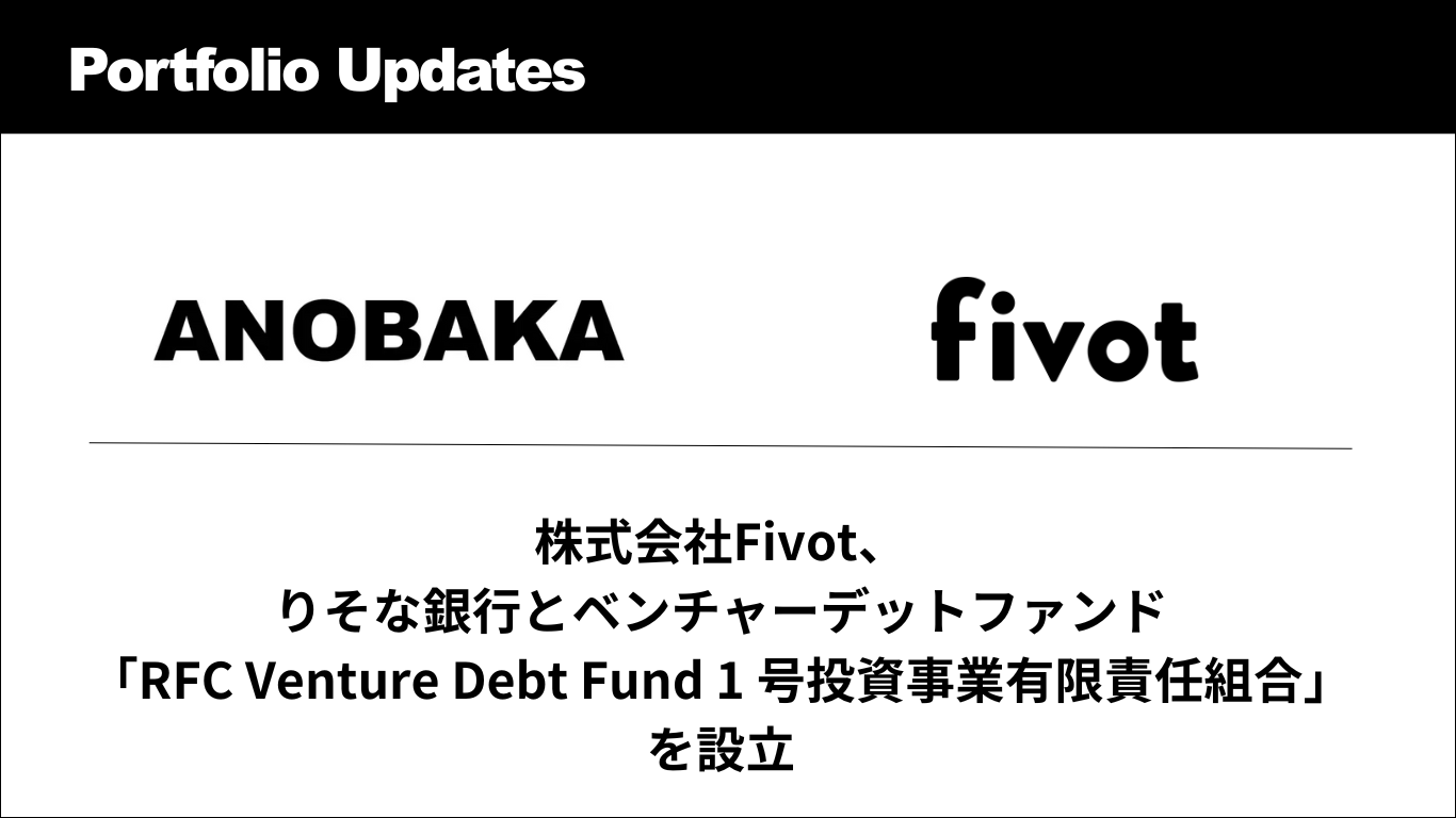 株式会社ANOBAKA(本社:東京都港区、代表取締役:長野泰和、以下、ANOBAKA)投資先である株式会社株式会社Fivotが、株式会社りそな銀行とシードからミドルステージの国内スタートアップ企業向け融資拡大を目的に、ベンチャーデットファンド「RFC Venture Debt Fund 1 号投資事業有限責任組合」を共同で設立したことをお知らせいたします。