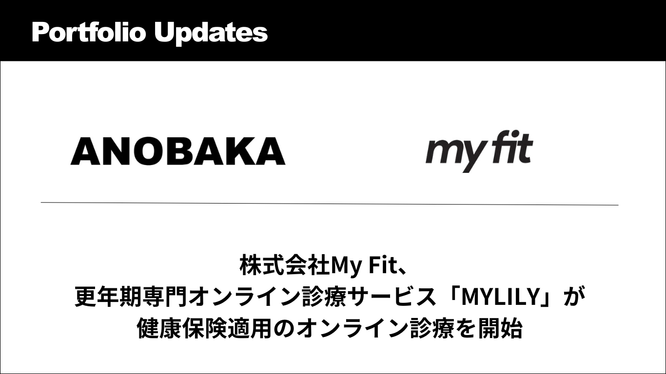 株式会社ANOBAKA(本社:東京都港区、代表取締役:長野泰和、以下、ANOBAKA)の投資先である株式会社My Fitは、更年期専門オンライン診療サービス「MYLILY」が健康保険適用のオンライン診療を開始したことをお知らせいたします。