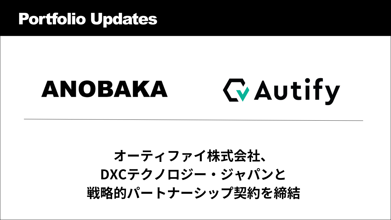 株式会社ANOBAKA(本社:東京都港区、代表取締役:長野泰和、以下、ANOBAKA)の投資先であるAutify, Inc.(米国サンフランシスコ)の日本法人オーティファイ株式会社は、DXCテクノロジー・ジャパン株式会社と、AIを活用したアプリケーション開発領域において戦略的パートナーシップ契約を締結したことをお知らせします。