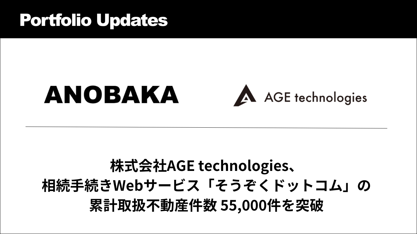 株式会社ANOBAKA(本社:東京都港区、代表取締役:長野泰和、以下、ANOBAKA)投資先である株式会社AGE technologiesが、ネット上で相続手続きを進められる“ネット相続”を提供する「そうぞくドットコム」(https://so-zo-ku.com/)において、累計取扱不動産件数が55,000件に到達したしたことをお知らせいたします。