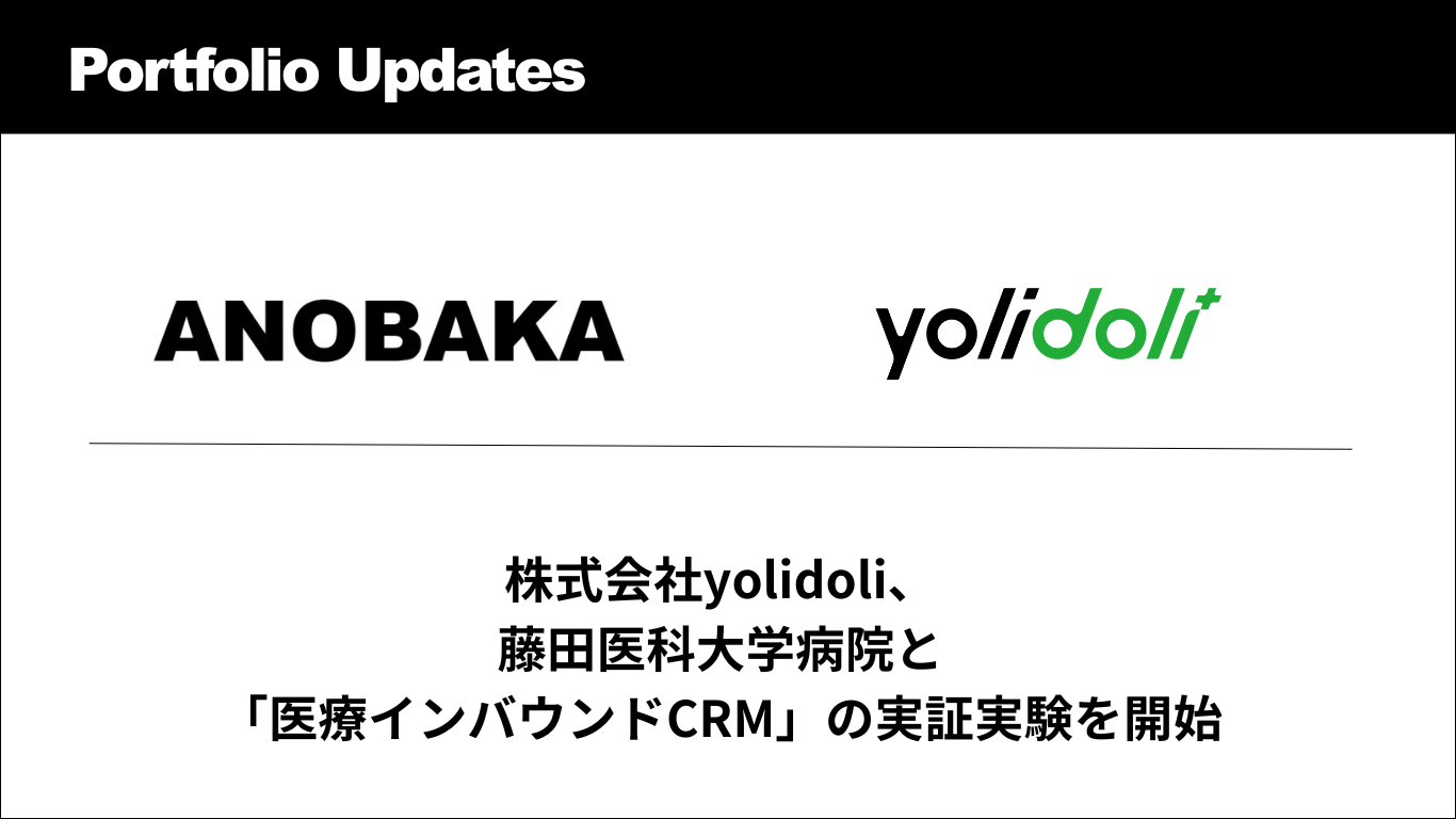 株式会社ANOBAKA(本社:東京都港区、代表取締役:長野泰和、以下、ANOBAKA)投資先である株式会社yolidoliは、、藤田医科大学病院と共同で、外国人患者の自費診療受け入れにおける事前調整・医療データ共有・院内外連携業務の標準化・効率化を目的とした「医療インバウンドCRM」の概念実証(PoC)を開始したことをお知らせいたします。