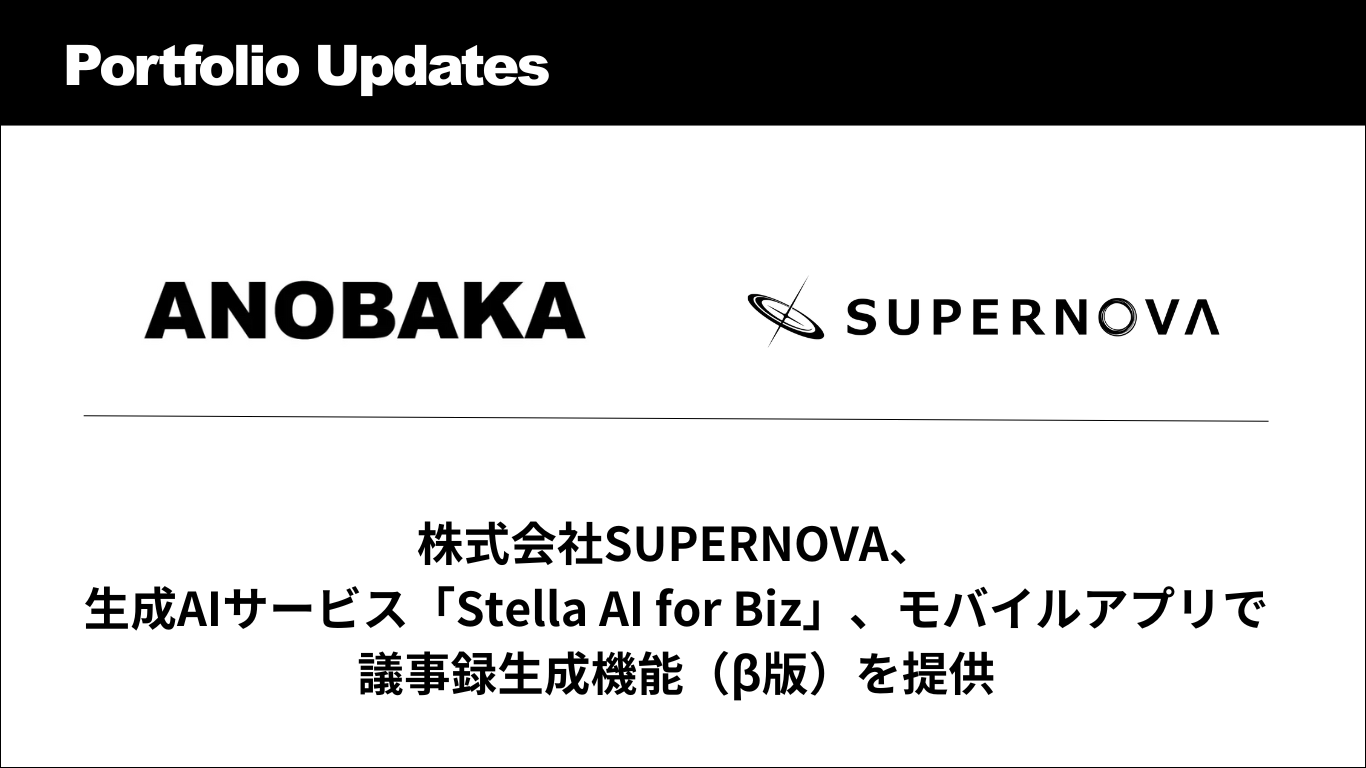 株式会社ANOBAKA(本社:東京都港区、代表取締役:長野泰和、以下、ANOBAKA)が運用するGenerative AIネイティブなスタートアップに特化した創業支援ファンド「GAIファンド」より出資した株式会社SUPERNOVAが、同社の生成AIサービス「Stella AI for Biz」でモバイルアプリで議事録生成機能(β版)を提供開始したことをお知らせいたします。