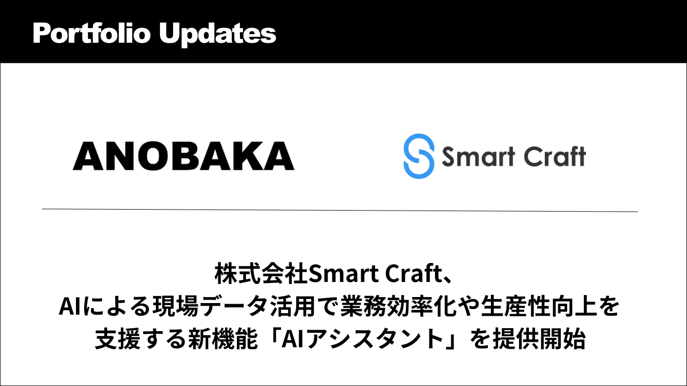 株式会社ANOBAKA(本社:東京都港区、代表取締役:長野泰和、以下、ANOBAKA)の投資先である株式会社Smart Craftは、クラウド工程管理・実績収集サービス「Smart Craft」において、現場業務を効率化・自動化する新機能「AIアシスタント」の提供を開始したことをお知らせいたします。