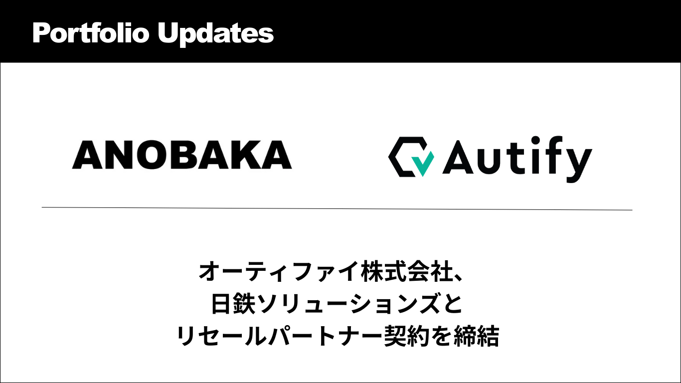 株式会社ANOBAKA(本社:東京都港区、代表取締役:長野泰和、以下、ANOBAKA)の投資先であるAutify, Inc.(米国サンフランシスコ)の日本法人オーティファイ株式会社は、日鉄ソリューションズ株式会社と、生成AIを用いたテスト自動化プラットフォーム「Autify」および関連サービスのリセールパートナー契約を締結したことをお知らせします。