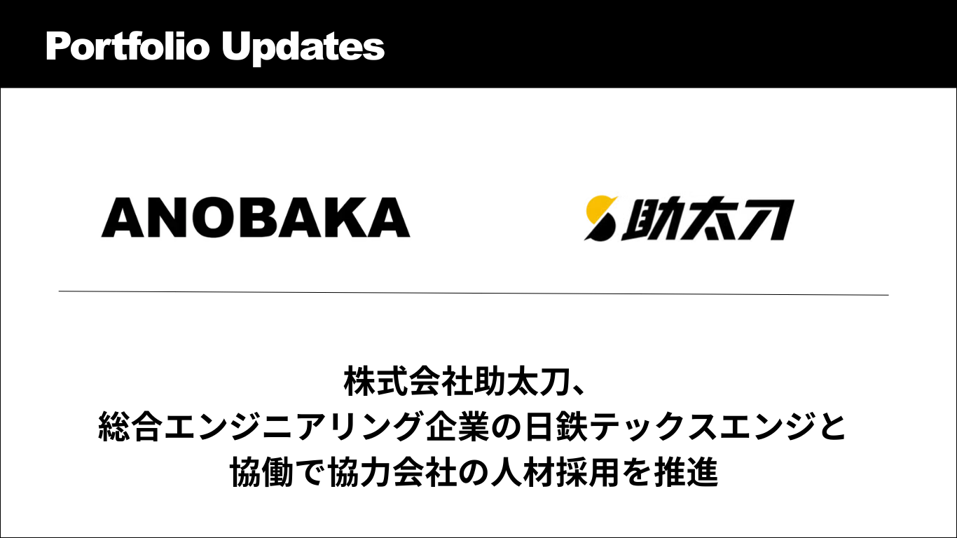 株式会社ANOBAKA(本社:東京都港区、代表取締役:長野泰和、以下、ANOBAKA)の投資先である株式会社助太刀は、日鉄テックスエンジ株式会社(所在地:東京都千代田区、以下「日鉄テックスエンジ」)と協働で、日鉄テックスエンジの協力会社における人材確保をサポートする取り組みを開始したことをお知らせいたします。