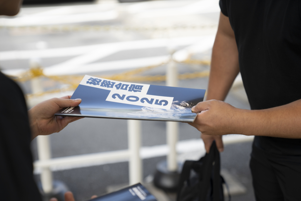朝の東京駅に集まった参加者たちは「秘密合宿 2025」と大きく書かれたパンフレットを受け取ると、次々にワクワクした顔でバスに乗り込んでいきます。