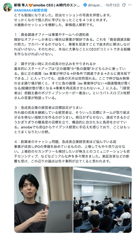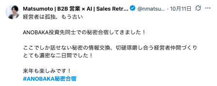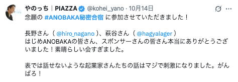 また、このレポートを通じて少しでも多くの方に「ANOBAKA 秘密合宿」の魅力を伝えることができていたら嬉しいです。秘密合宿はANOBAKAファミリー限定のイベントですが、今後も新たな投資先の皆さまと一緒にどんどん良いものにしていきたいと思っていますので、参加にご関心をお持ちの方はぜひ一度お話させてください!