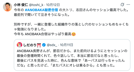“直感的にわかる”ような短い言葉でまとめた結果SNSでの拡散性・発信性も上がり、去年よりも多くの参加者の方にリアルタイムで「#ANOBAKA秘密合宿」を付けた投稿をシェアしていただきました!