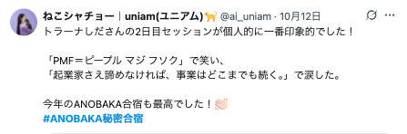そんな時、ある投資先の方が「ANOBAKA秘密合宿に参加しました。」とツイートされているのを見つけ、「これいいじゃん!」と社内でも賛同の声があがり、ANOBAKA SECRET CAMPはANOBAKA 秘密合宿という名前に変更にすることになりました。