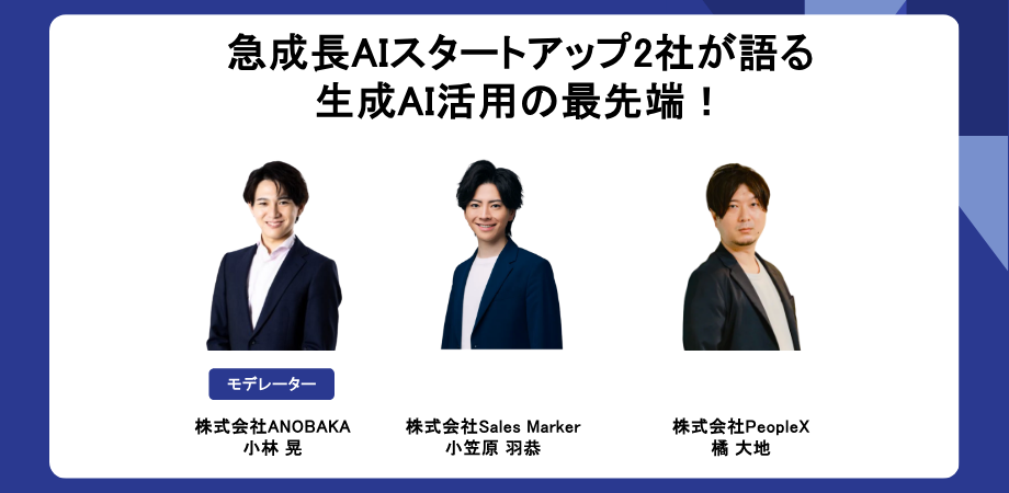 前回から「Generative AI Conference Tokyo」にて実施したセッションの内容についてお届けしていますが、2本目となる今回はAIを活用して急成長中のスタートアップとして、株式会社Sales Marker 代表取締役CEO 小笠原 羽恭氏・株式会社PeopleX 代表取締役CEO 橘 大地氏にご登壇いただいたセッションの内容についてお届けしていきます!