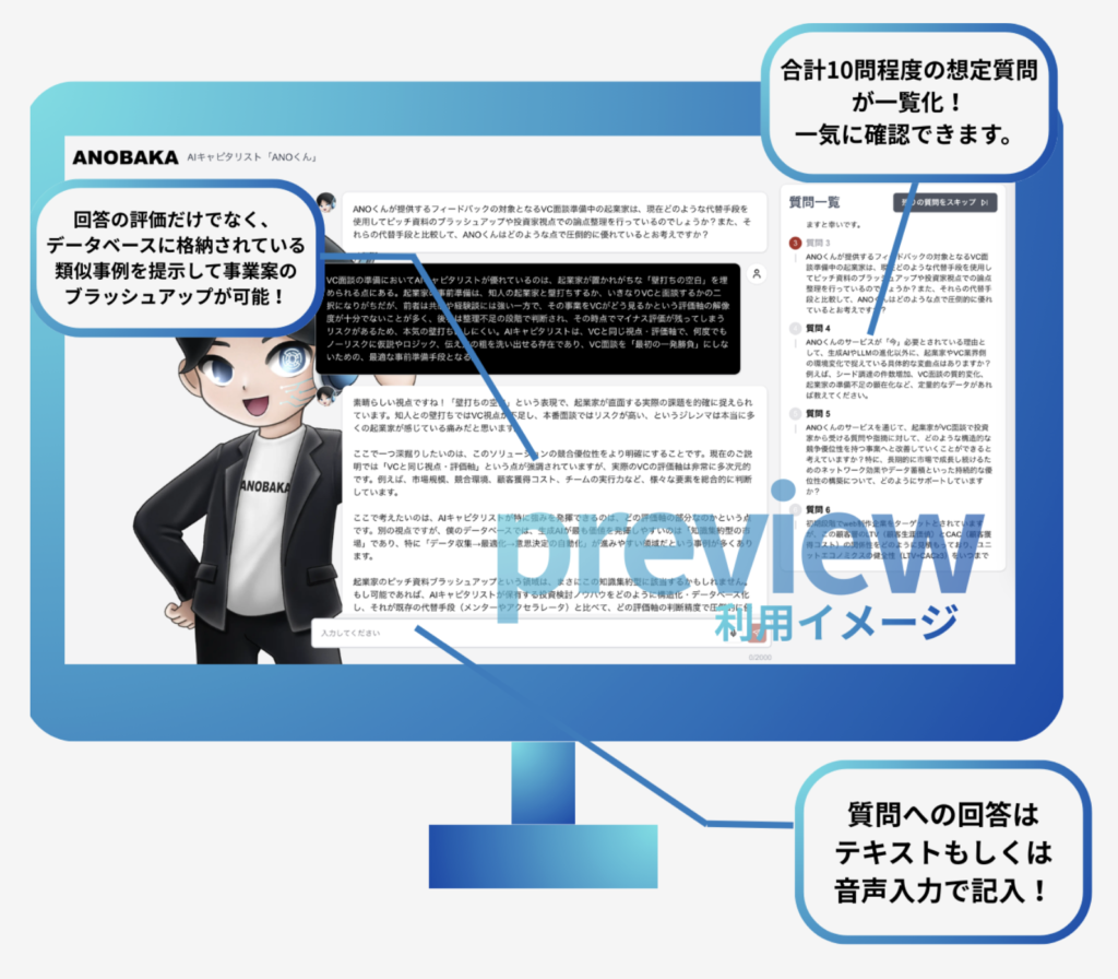 ANOBAKAが10年以上にわたり蓄積した累計1,500件超の投資ノウハウを学習し、起業家のピッチ資料を読み込み、VCの視点で論点を整理。初めての資金調達に挑む起業家にとって、24時間365日頼れる相談相手となっています。